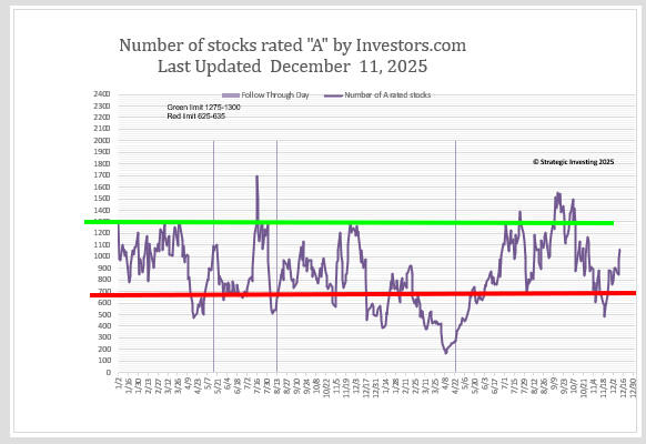 Investors should be concerned if the number of A's are unable to remain above the red zone as it is often the sign before a major correction begins.